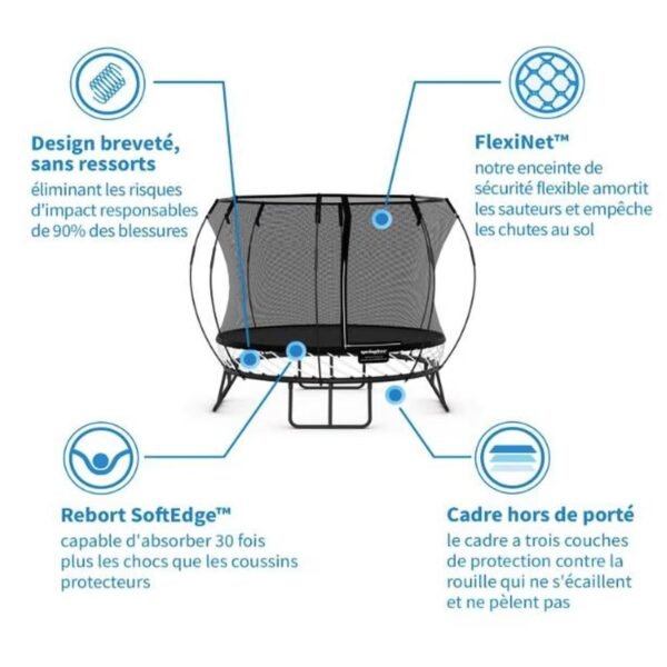 Ce modèle se démarque par son équilibre parfait entre sécurité, confort et plaisir. Grâce à sa conception unique et son approche innovante, il garantit une expérience de saut inégalée. Que vous soyez un amateur ou un utilisateur expérimenté, ce trampoline saura répondre à vos attentes en matière de qualité et de performance.